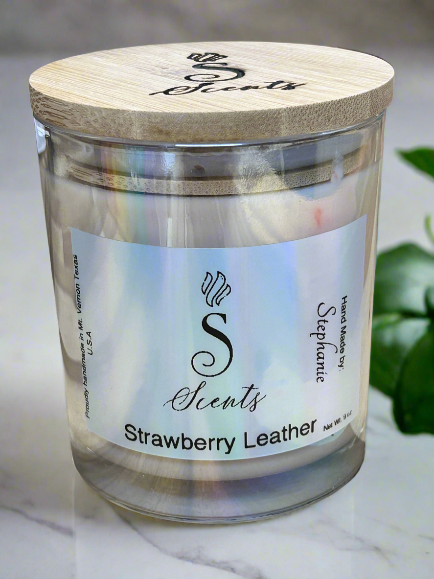 7 oz Glass Leather Iridescent Candle with Bambo Lid Strawberry Leather